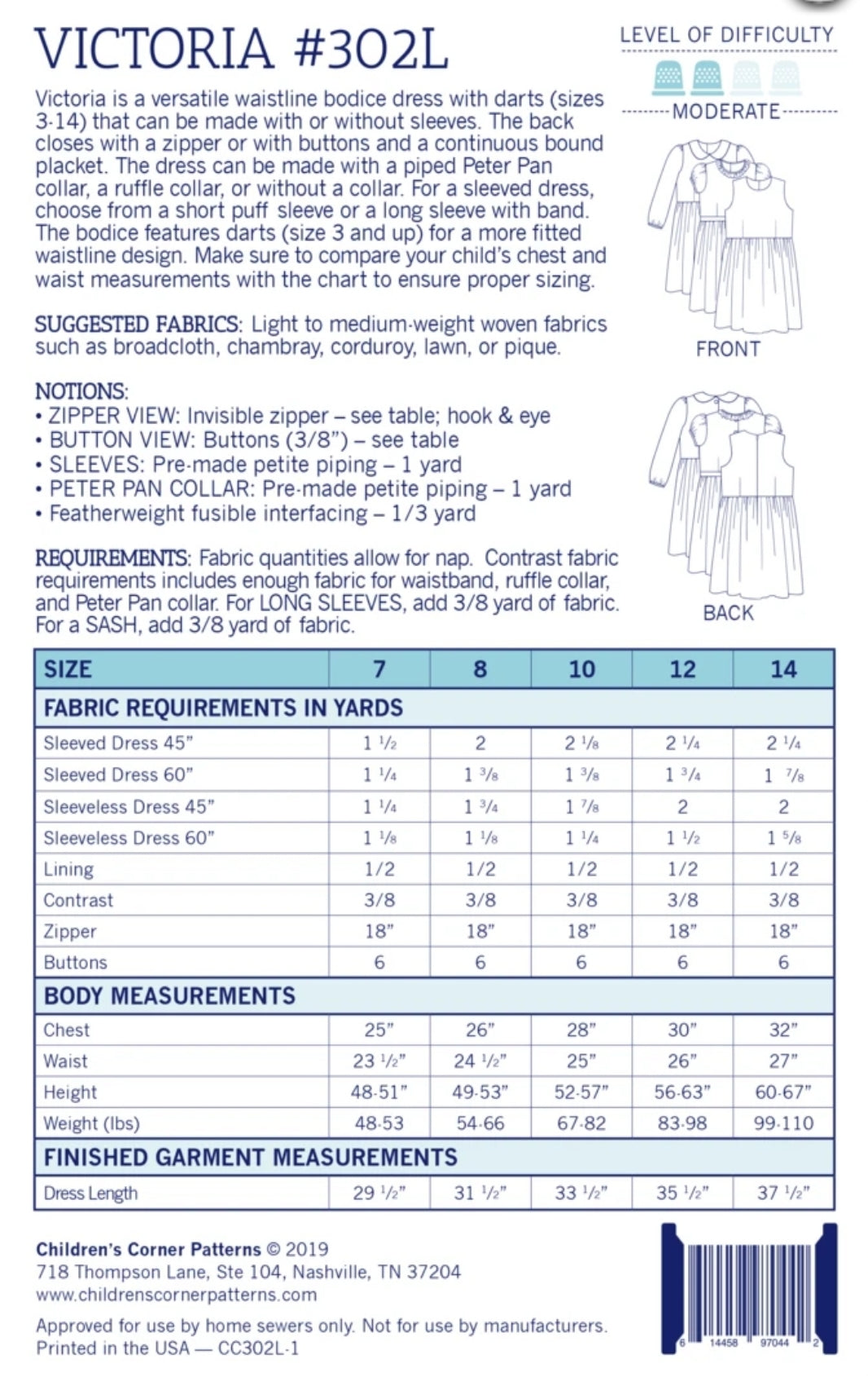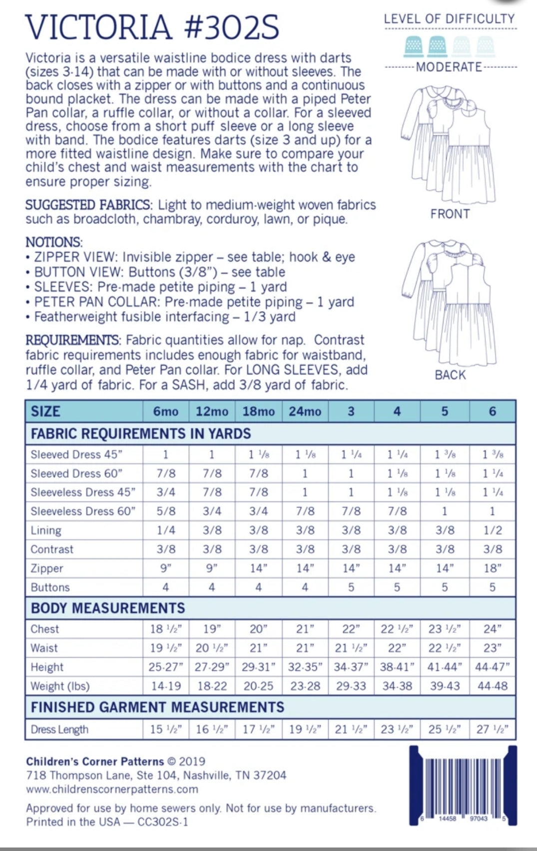 Victoria is a versatile waistline bodice dress that can be made with or without sleeves. The back closes with a zipper or with buttons and a continuous bound placket. The dress can be made with a piped Peter Pan collar, a ruffle collar, or without a collar. For a sleeved dress, choose from a short puff sleeve or a long sleeve with band. The bodice features darts (size 3 and up) for a more fitted waistline design. The waist is accented by a waistband or a sash. Make sure to compare your child’s measurements with the chart to ensure proper sizing.